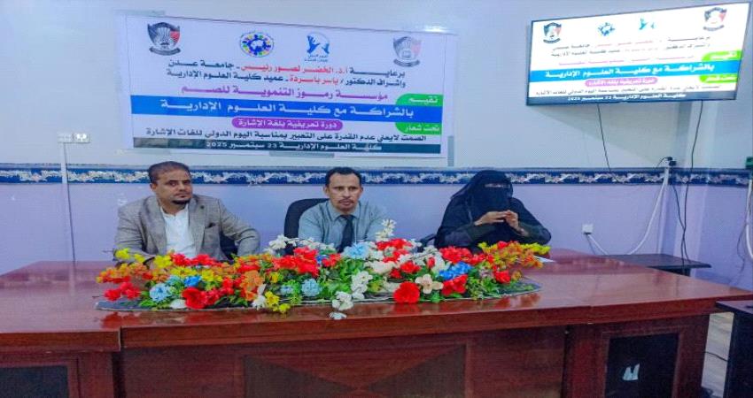 برعاية كريمة من الأستاذ الدكتور/الخضر ناصر لصور رئيس جامعة عدن، وبإشراف مباشر من عميد كلية العلوم الإدارية الدكتور/ياسر باسردة، نظّمت مؤسسة رموز التنموية للصم بالشراكة مع كلية العلوم الإدارية، دورة تد...
